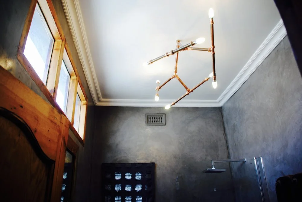 This facelift from top to bottom included new ceilings, electrical LED downlight, creative pendant and drop lighting, open plan living/dining with convenient island, stackable doors leading to back yard, built in garden couch and planters, cement exterior pavers with drought resistant strips of artificial lawn, new bathroom with coloured plastered walls, towel hooks made from old railway screws and copper light fixture, and white cement flooring. The only original remaining items we made use of were the wood doors that were stripped and sanded down and new hardware added. Up cycled wooden windows replaced the old rusted aluminum ones and recycled burglars bars were re-designed for a more subtle effect. The soothing grey and white paint tones helped create a comfortable and dramatic atmosphere for this home to live and entertain in.